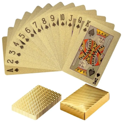 Zestaw złotych klasycznych kart do gry, sztuczek magicznych i wielu wielu innych. Kart są pokryte efektowną złotą folią, wykonane z plastiku. Plastik ma przewagę nad kartami papierowymi, ponieważ jest wodoodporny oraz odporny na zginanie - przez co karty nie będą znaczone. Zestaw zawiera 54 karty, standardowe 52 oraz 2 jokery.