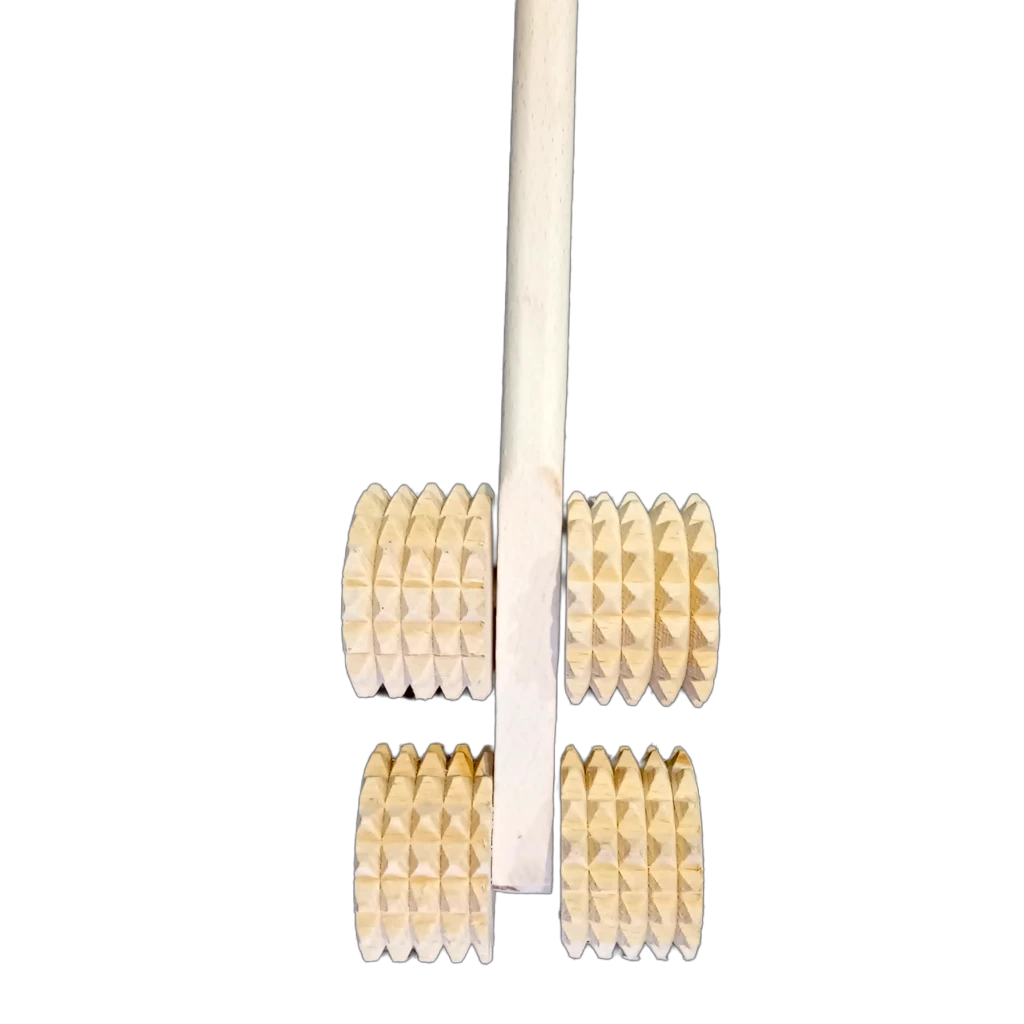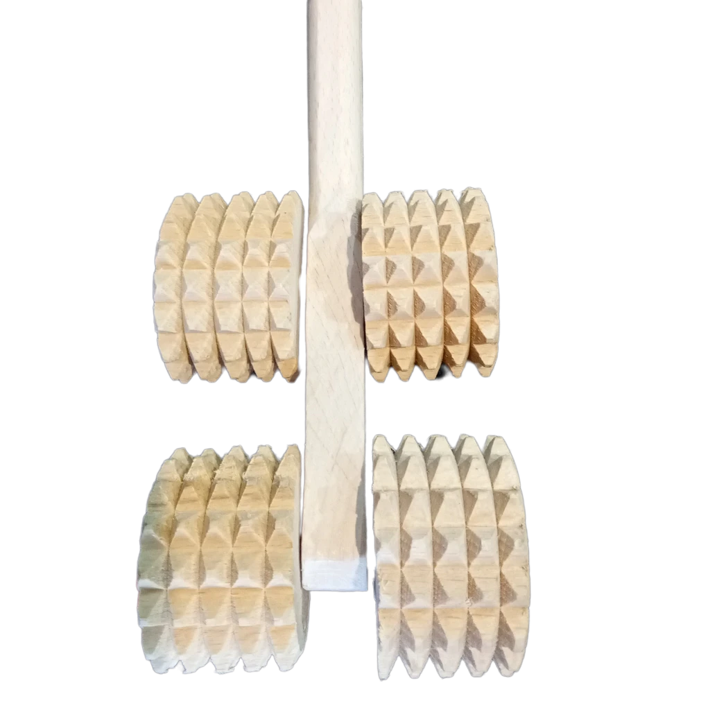 Drewniany masażer do ciała z rączką – masażer ręczny 4 rolki