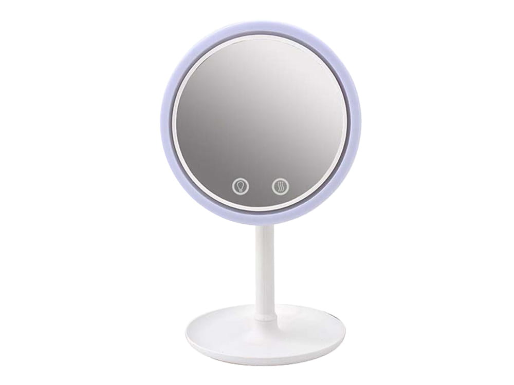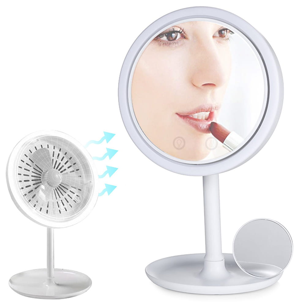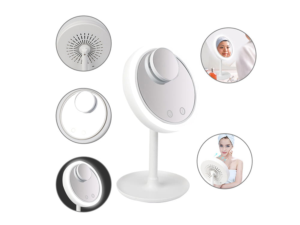 Wokół lustra zamontowane zostało oświetlenie ledowe, dzięki czemu możemy dokładnie zobaczyć swoje odbicie. Na lusterku wbudowane są dwa przyciski, jedno służy do oświetlenia LED, drugie do nawiewu. Lusterko posiada trzy stopnie regulacji nawiewu. Wentylator zapewnia chłód podczas nakładania makijażu.